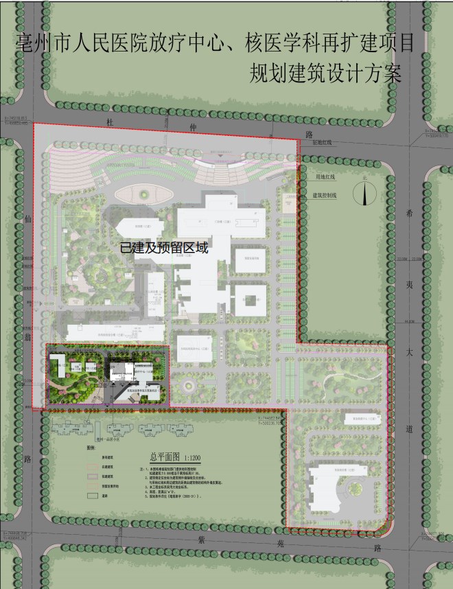 亳州市人民医院原有放疗中心面积不满足日常使用需求,且缺少PECT、SPECT等核医学科用房,现建设在该项目预留用地内新建一栋放疗中心、核医学科楼。新建放疗中心、核医学科楼4530.74平方米(地上4257.09平方米,地下273.65平方米)。扩建后容积率1.18,建筑密度18.23%,绿地率35.01%。