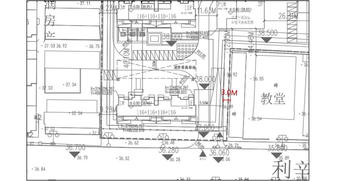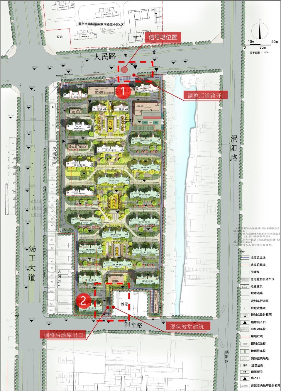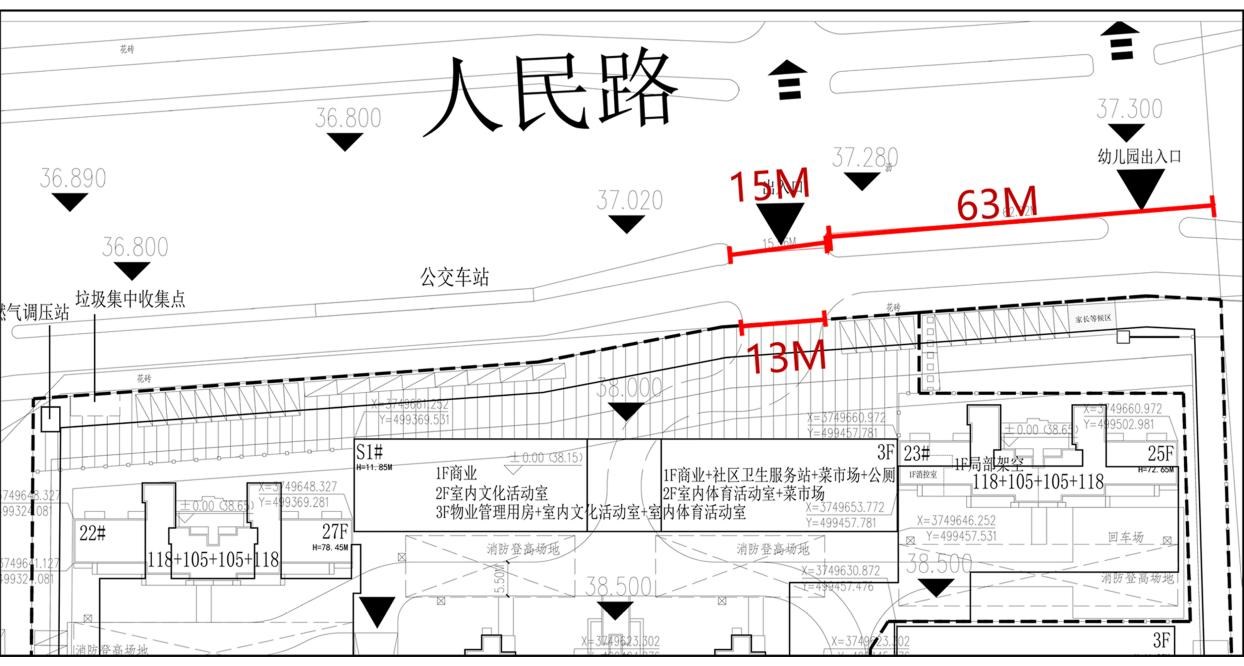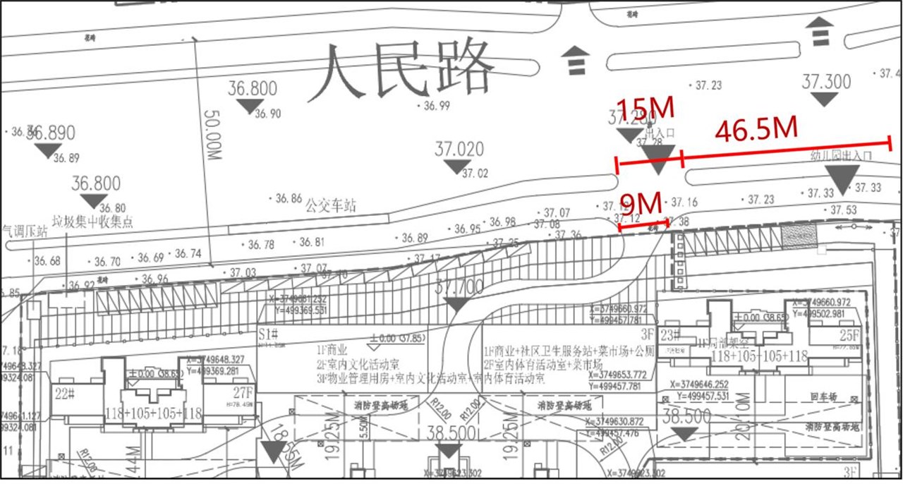 调整内容:1、因地块北侧现状有信号塔,且不便移动,调整后将项目北侧机非隔离带开口向东平移16米。2、南侧地下车库出入口距离教堂附属楼过近,调整后将车库出入口向西移动,加大与教堂附属楼的距离。3、根据深化设计并通过审图后的施工图,将地下车库面积由原方案47006.92平米增加至47460.17平米。