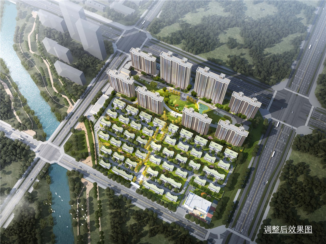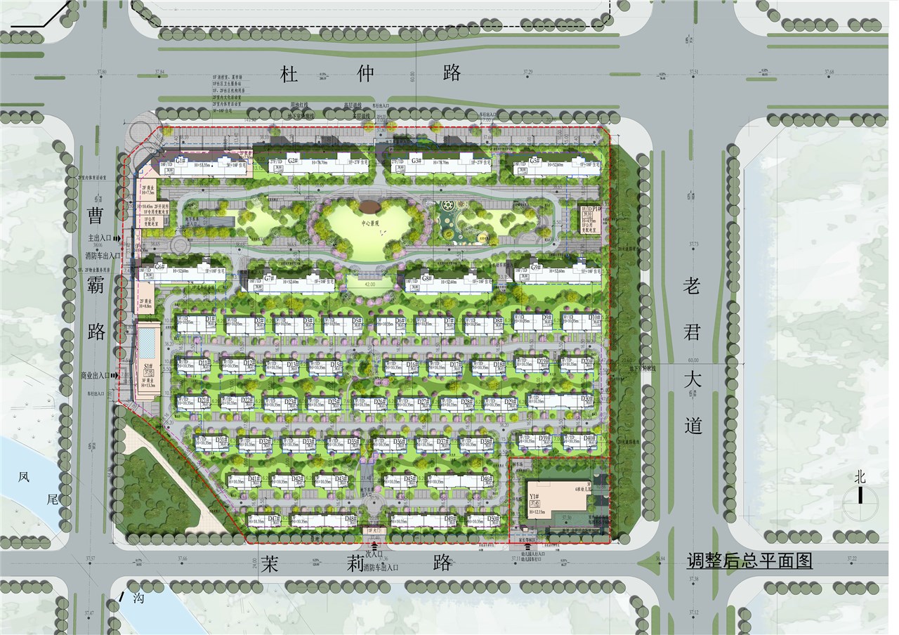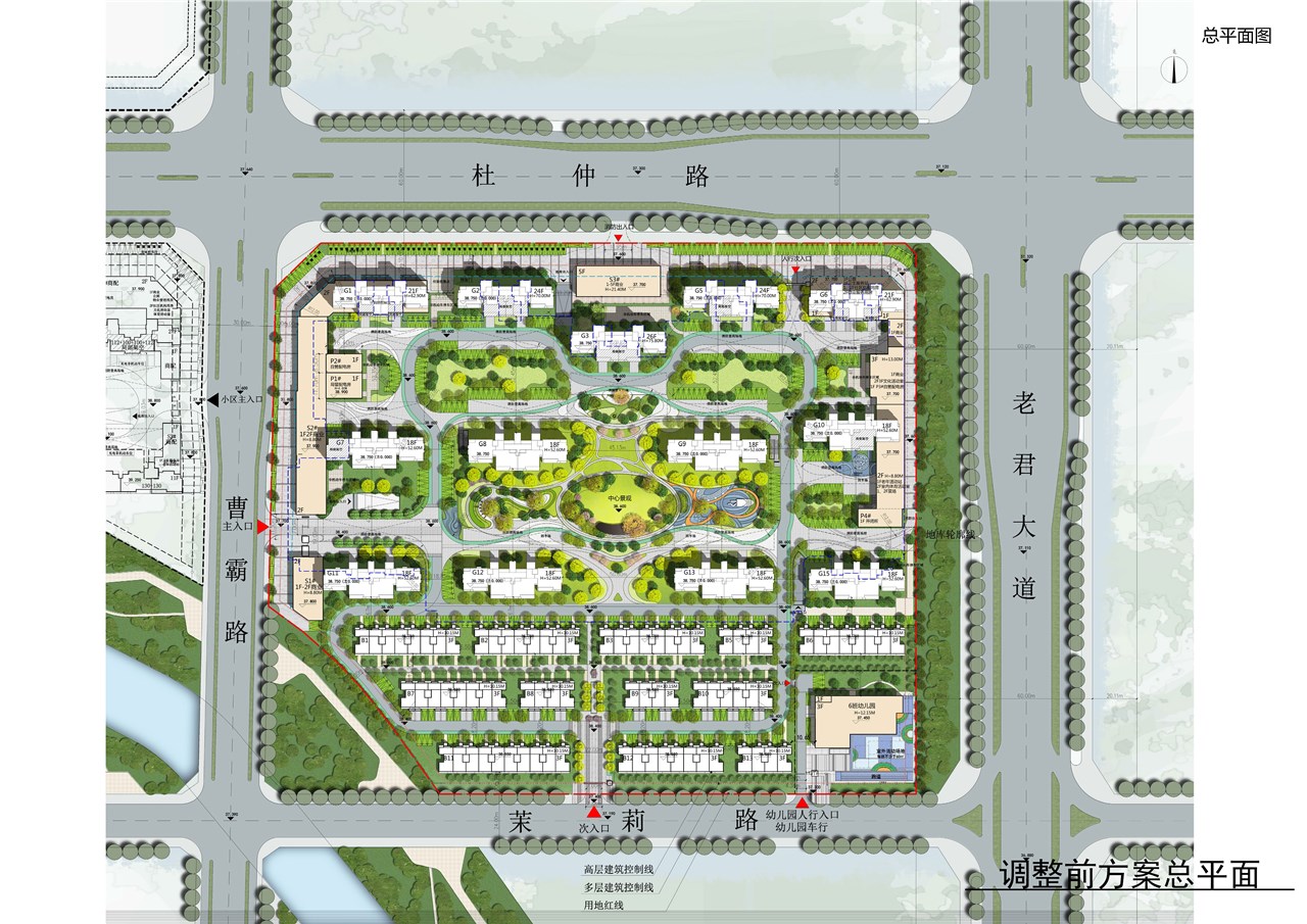 1、规划布局调整。高层住宅从三排改为两排,增加低层住宅面积,优化户型设计,北侧杜仲路增加出入口。