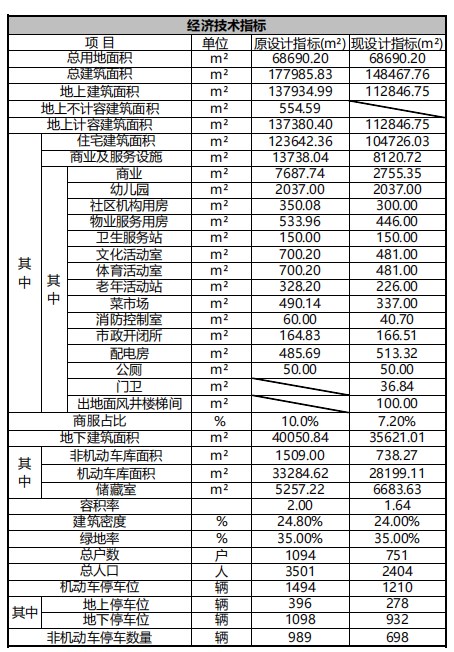 2、规划指标调整。容积率由2.0降低至1.64,计容建筑面积由137380.4㎡调整为112846.75㎡,住宅户数由1094户减少至751户。