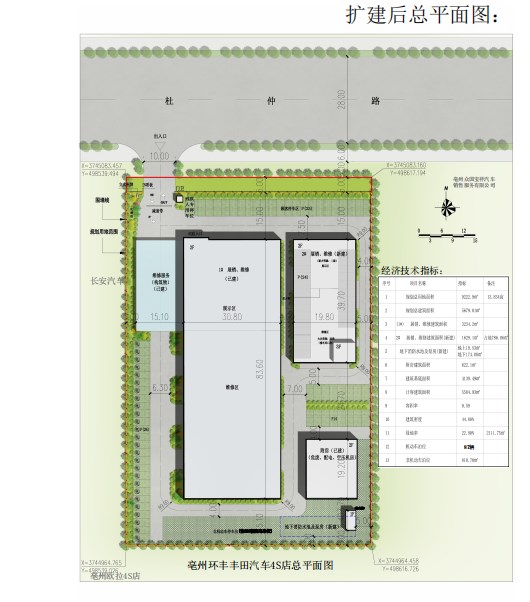 二、扩建内容:在项目内东北侧原停车场位置新建一栋 2 层钢结构展销、维修楼,建筑面积 1629.1 平方米;在项目内东南侧原非机动车停车位位置新建一栋 1 层泵房及地下消防水池,建筑面积 193.61 平方米;对新建建筑周边的停车区和绿化区进行优化。