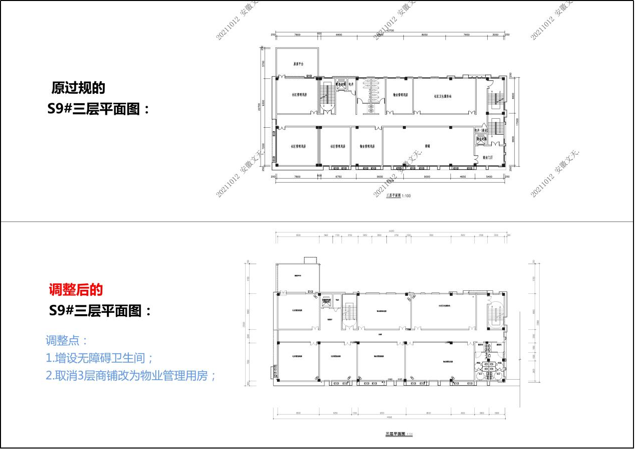 二、主要调整内容:S9#、S10#内部功能调整,增设无障碍卫生间。前后经济技术指标不变。具体见下图: