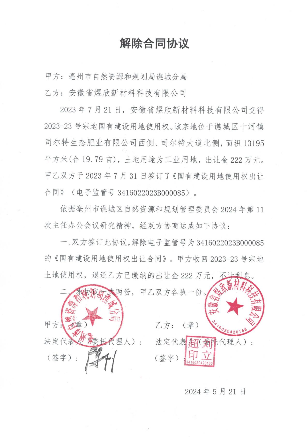 经开发区会同市自然资源和规划局谯城分局与安徽省煜欣新材料科技有限公司协商,有偿收回土地使用权。亳州市谯城区自然资源和规划管理委员会2024年第11次主委办公会研究同意安徽省煜欣新材料科技有限公司收回2023-23地块土地使用权,解除国有建设用地使用权出让合同,返还已缴纳的出让金222万元,不计利息。