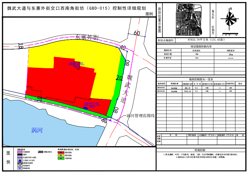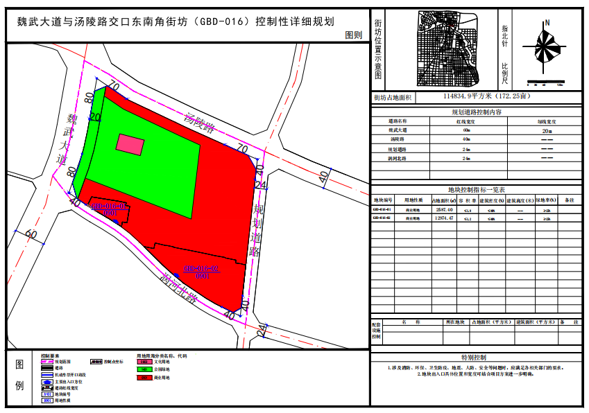 根据《城乡规划法》有关规定,现将魏武大道与东寨外街交口西南角街坊(GBD-015)、魏武大道与汤陵路交口东南角街坊(GBD-016)控制性详细规划公示如下: