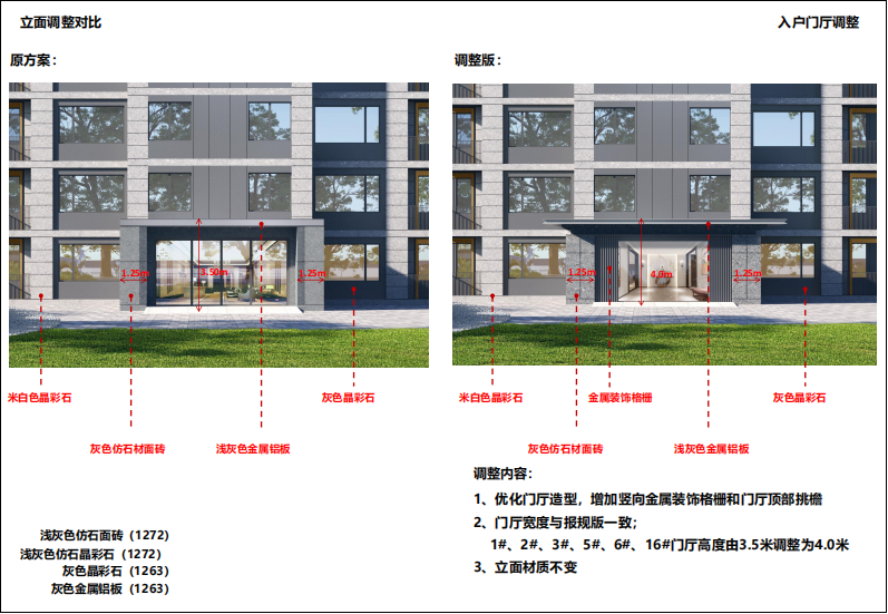 (3)为提高业主归家礼仪感受及立面层次感,多层住宅门厅优化调整,增加竖向装饰格栅和门厅顶部挑檐,门厅高度由3.5米调整为4.0米。