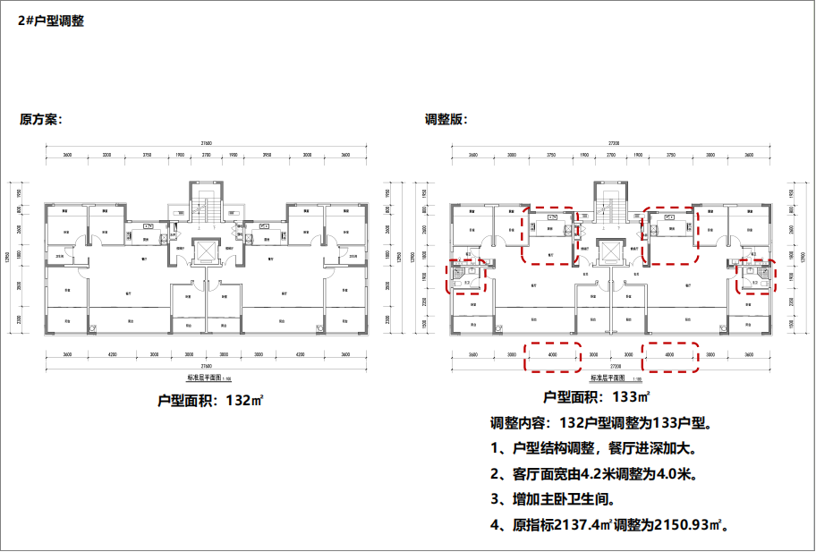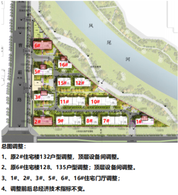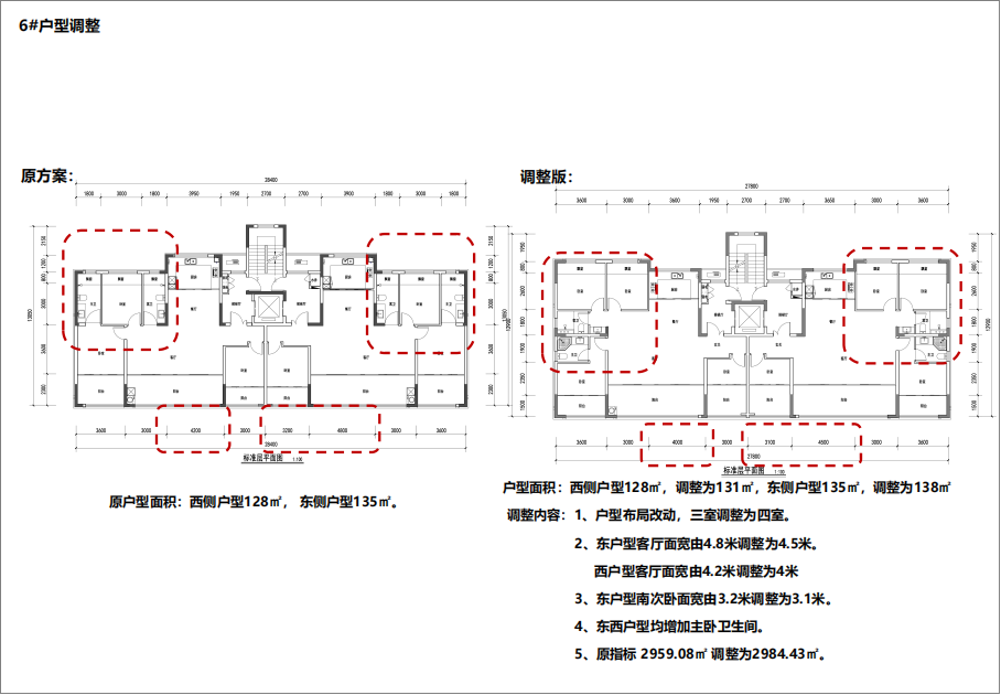 (1)为适应客户多层次的需求,原2#住宅楼132㎡户型调整为133㎡,内部户型进行优化完善;原6#住宅楼128㎡户型调整为131㎡户型,135㎡户型调整为138㎡户型,同时减少顶层设备间面积;