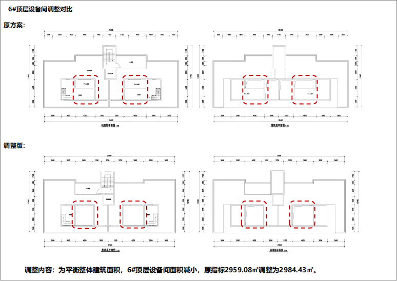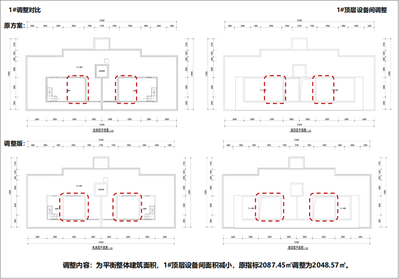 (2)为平衡调整的建筑面积,1#顶层设备间面积减少,原指标2087.45㎡调整为2048.57㎡。