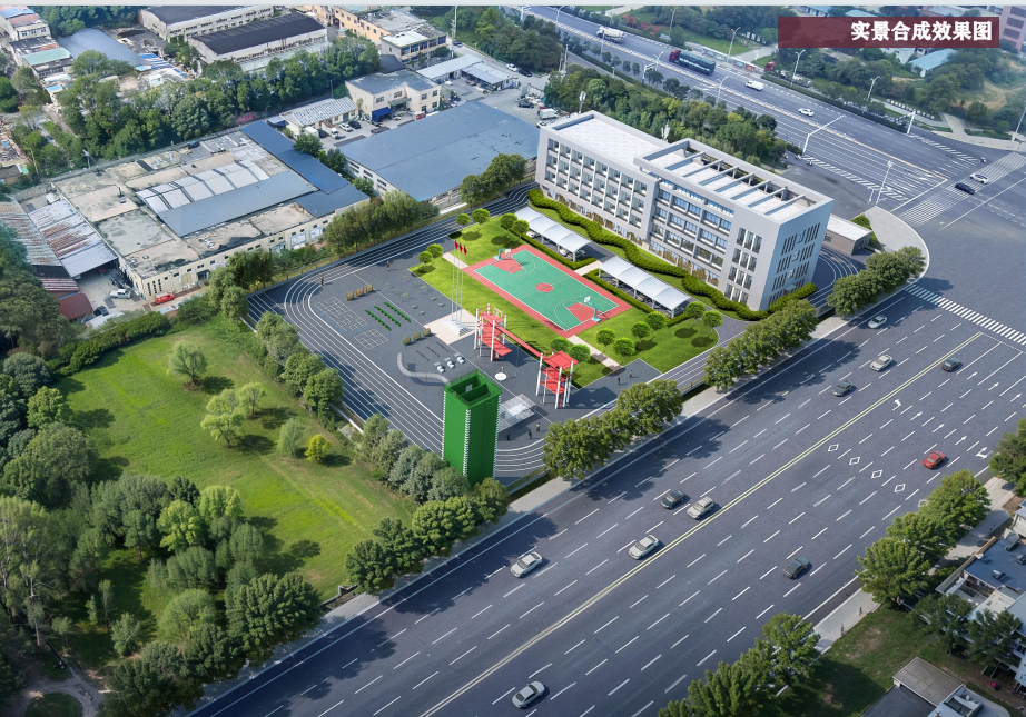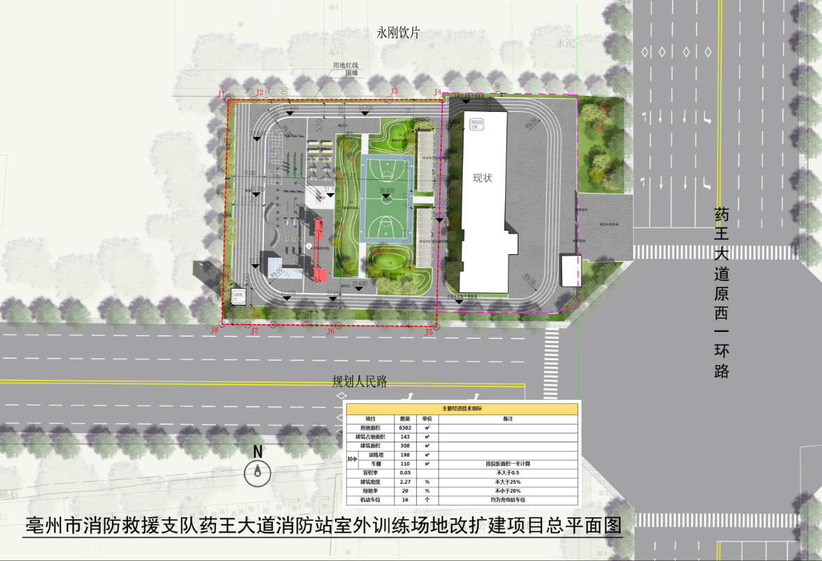 设计说明:本方案主要为药王大道消防站室外训练场地,主要构筑物为车棚及训练塔,剩余区域做训练器材和跑道使用。