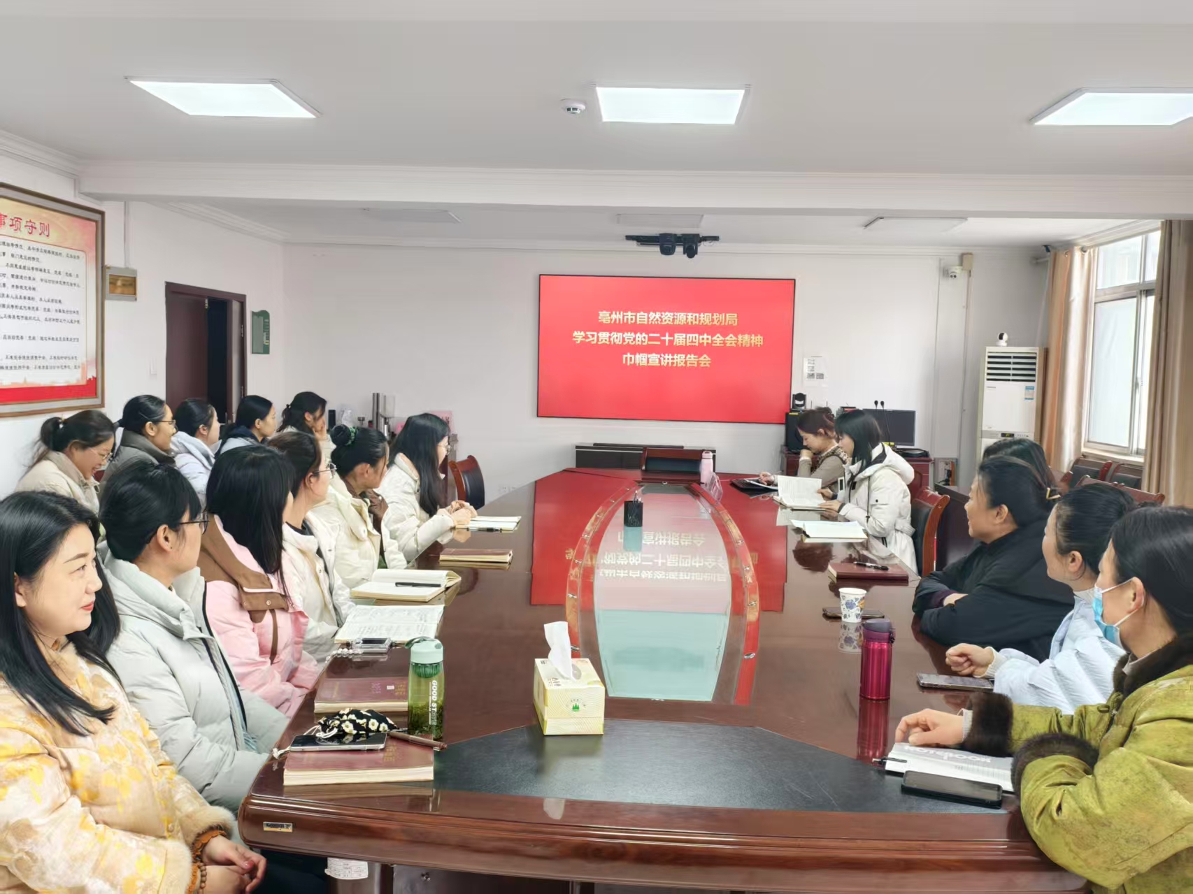 为深入学习贯彻党的二十届四中全会精神,凝聚巾帼力量护航“十五五”新征程,12月26日,亳州市自然资源和规划局举办了学习贯彻党的二十届四中全会精神巾帼宣讲报告会,局机关各科室、直属各单位女职工参加会议。