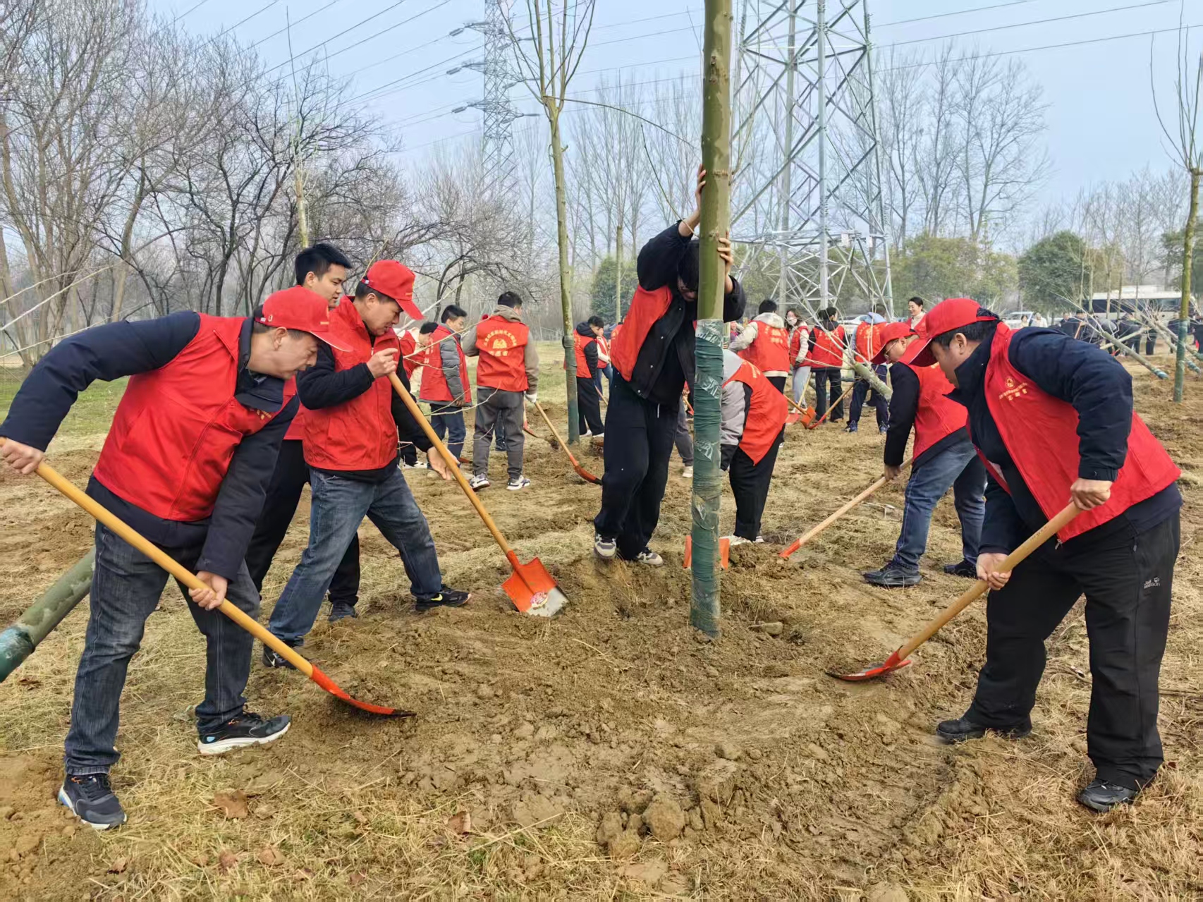 植树现场,一派热火朝天的忙碌景象。参加植树的志愿们热情高涨、干劲十足,大家三五成组,分工协作,配合默契。挥锹铲土、扶苗填坑、培土围堰、提水浇灌,每一道工序都做得一丝不苟、认真细致。经过一番辛勤劳作,100余株新栽下的梧桐苗木迎风挺立、错落有致,在春日暖阳中焕发出勃勃生机,为初春的大地播撒下绿色的希望。