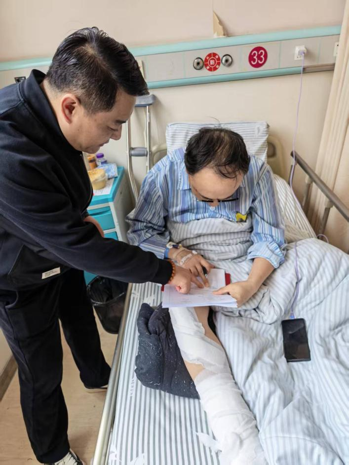 王先生因意外导致腿部骨折,需长期卧床休养,无法到窗口现场办理业务。了解到这一特殊困难后,中心第一时间启动上门服务机制,统筹兼顾窗口日常工作与群众办事需求,安排两名工作人员放弃午休、携带资料赶赴医院。在病床前,工作人员认真核对王先生身份信息,细致查验相关材料、耐心讲解办理流程,仅用20分钟就办结全部手续,真正实现了群众“一次不用跑”、服务“送到家门口”。