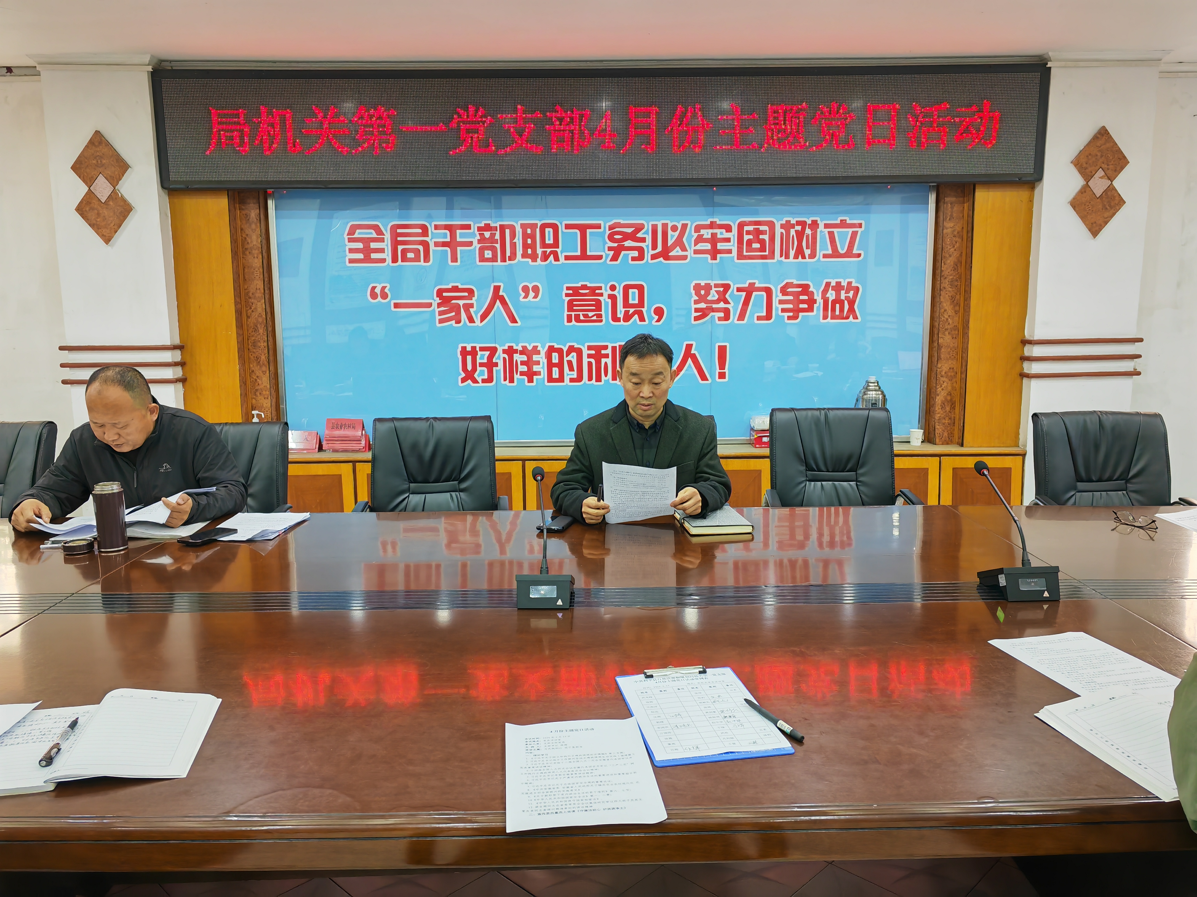 近日,利辛县自然资源和规划局机关第一党支部在党员活动室开展4月份主题党日活动,全体党员参加,党支部书记徐辉主持,党组书记、局长武龙峰党组成员、副局长汪海洋,以普通党员身份参加。